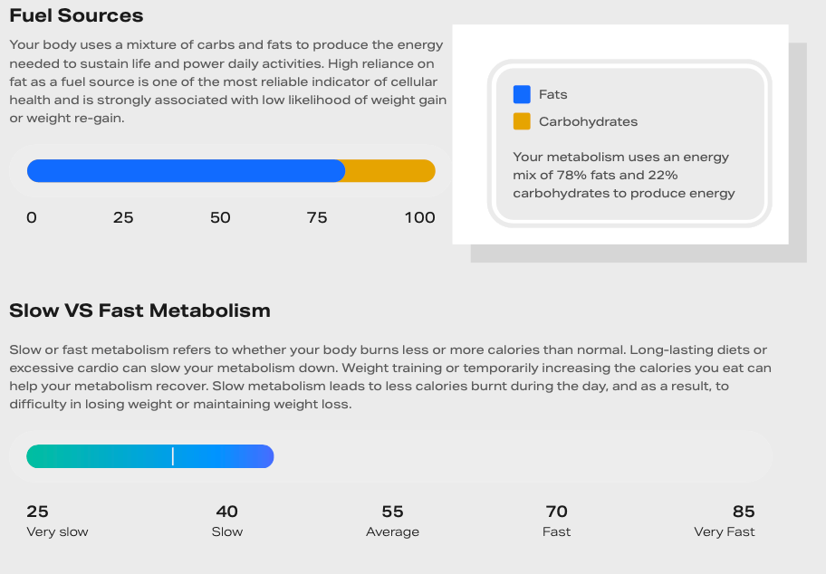 Your metabolism speed, refers to how efficiently your body can use the calories its given. Our test can determine whether your current metabolism is fast or slow compared with others of the same, age, height and weight. We can use this information to direct your training and diet to improve where needed.